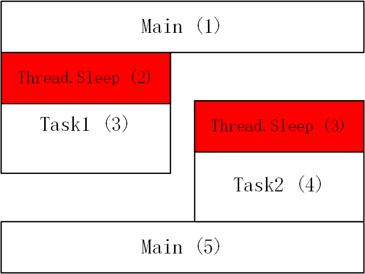 如果希望程序像下图一样同时开始执行两个Task,可以使用Task.Run()指定一个Task在线程池中执行。