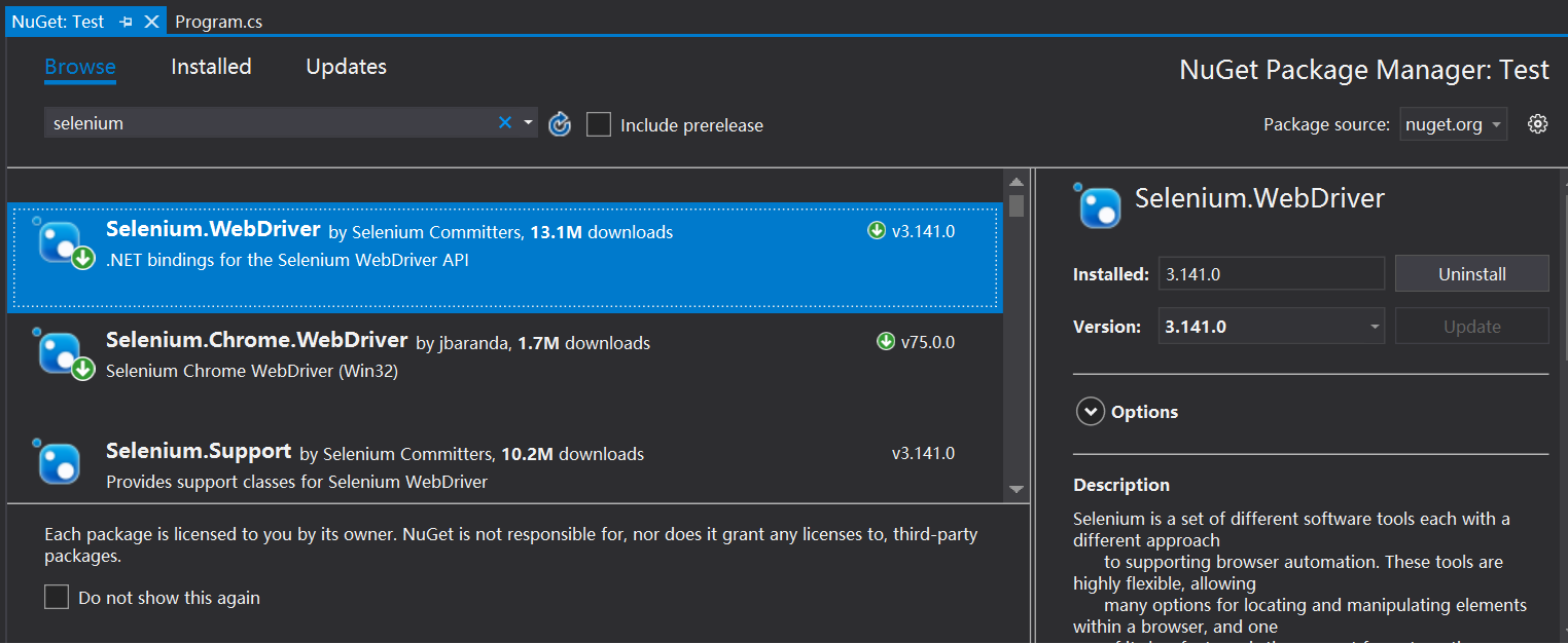 C#中安装Selenium非常简单,需要通过nuget包管理器搜索"selenium"安装两个包: