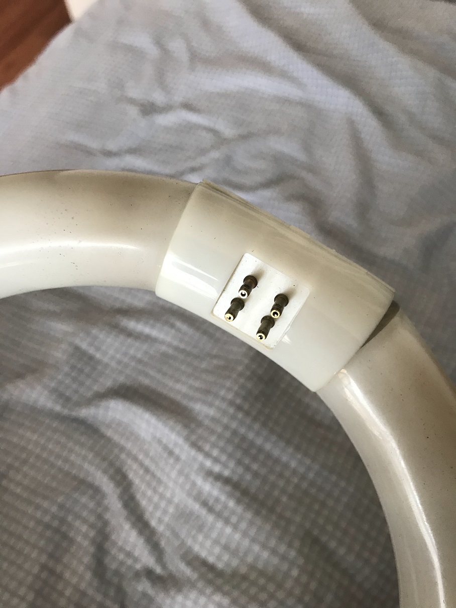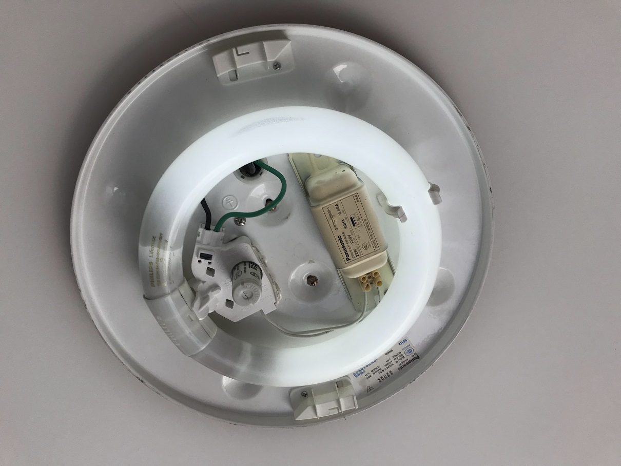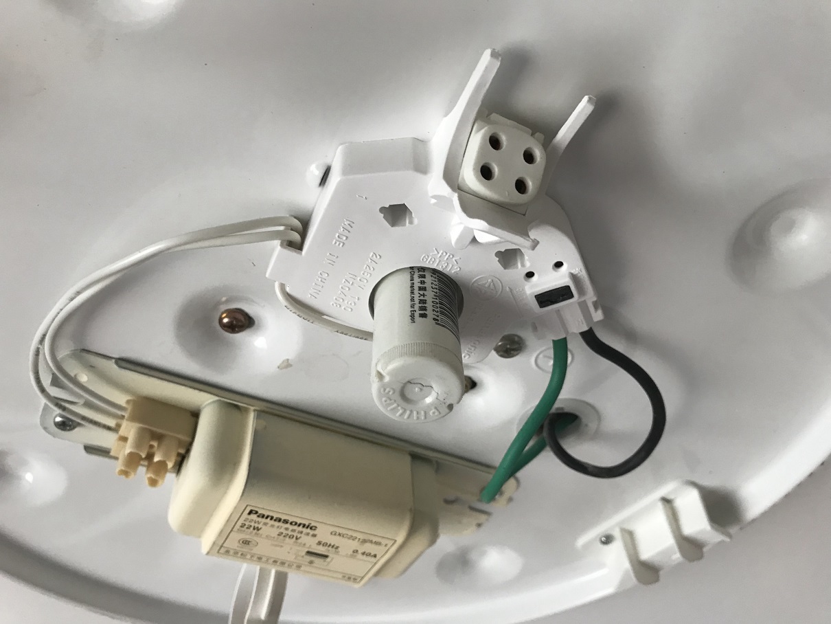 吸顶灯不亮有两个常见原因,要么是灯泡坏了,要么是启辉器坏了(新式的吸顶灯已经不用启辉器了)。这灯晚上点不亮,早上居然点亮了几次又不亮了,考虑是启辉器坏了。下图所示的灯并未完全点亮,更确定是启辉器的问题。