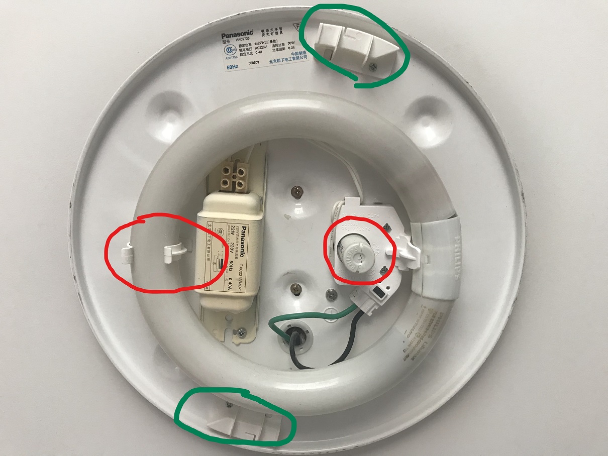 首先取下亚克力灯罩,不同型号可能方法不同,松下的HAC2733是有两个卡口如下图绿色圆圈所示,左旋即可取下。