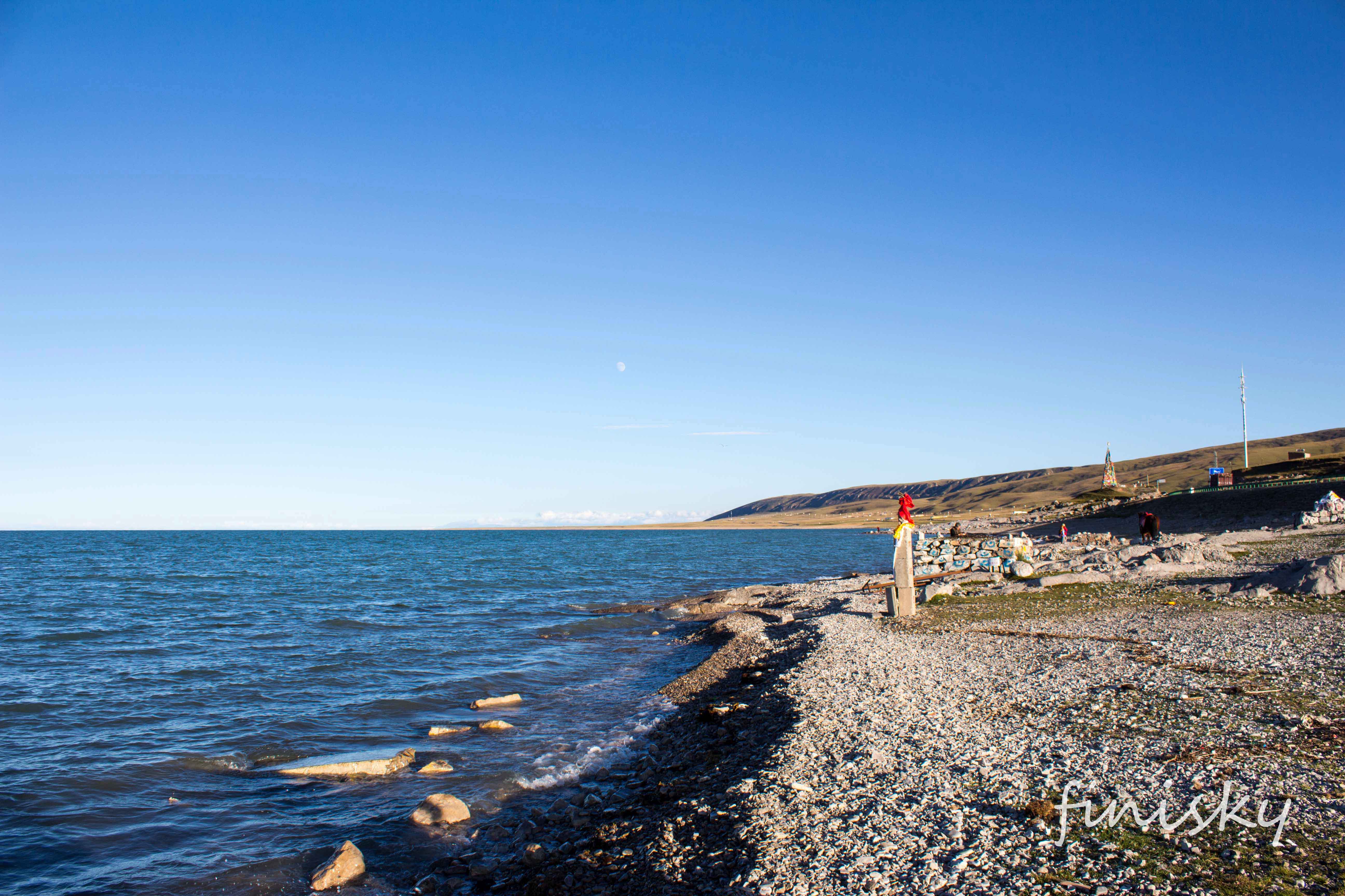 最后做了个折衷,虽然晚上住茶卡,但往环湖西路再开一段,那边有一处地方离湖也非常近。开车到了那边之后发现果然不错,有观景台和湖边可以下去,不过旁边蒙古包的藏民收每人5块钱。