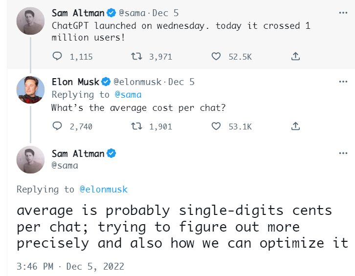 OpenAI不是做商业化产品的公司。但如果真的考虑产品化,那么上线这样的模型,每次调用的成本不可小觑。马斯克就在Twitter中问到每次调用的成本几何: