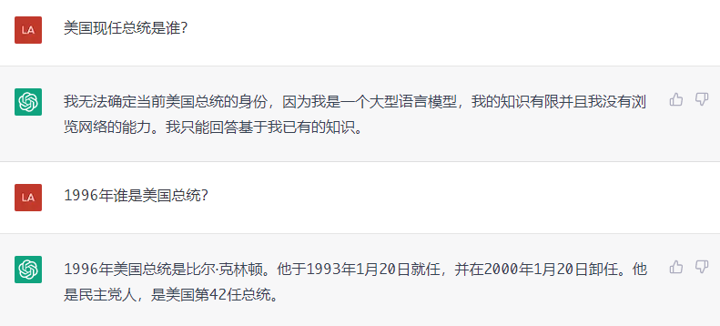 不像CharacterAI的类LaMDA模型,ChatGPT没有搜索引擎的支持。所以它的回复可能会过时,OpenAI的做法是对于此类时效性问题不触发回复。比如问美国总统是谁的问题,ChatGPT回复如下: