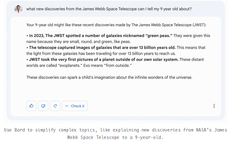 Bard能将广泛的知识与大模型结合,从网上找到最新和高质量的信息并回复给用户。目前ChatGPT尚不具备这种能力,因为它还未与搜索API结合,这是LaMDA的长处。下面的demo展示了它可以将NASA空间望远镜向一个9岁的小孩解释: