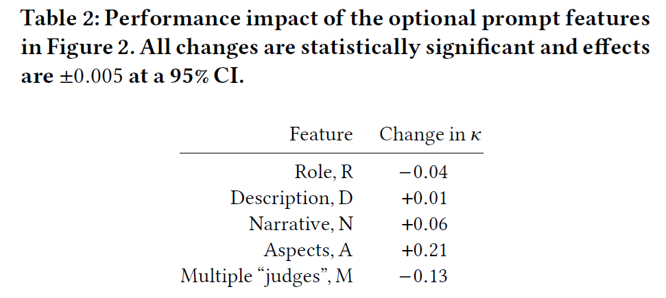 上图显示了实验结果,其中R = include role, D = include description, N = include narrative, A = include aspects, M = include multiple “judges”。共有32种prompt的排列组合,例如,--N-M代表使用narrative和multiple judges的方案,最优结果用星号标了出来。可见,最优prompt包括description, narrative和aspects三个部分。