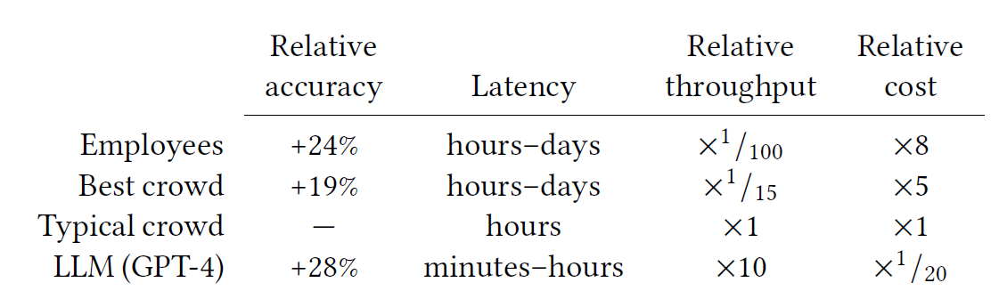 上图可见,LLM 表现得非常出色。它们比任何第三方标注者(包括员工)都更准确;与任何人类评审员(包括众包工人)相比,它们的端到端速度更快;它们的吞吐量更高;而且当然成本要低得多。端到端速度的显著提升也帮助 Bing 的工程师们能够尝试更多方案,完成更多工作。自 2022 年底以来,Bing一直在将 LLM 与专家人类标注者结合使用,用于大部分的离线指标评估。