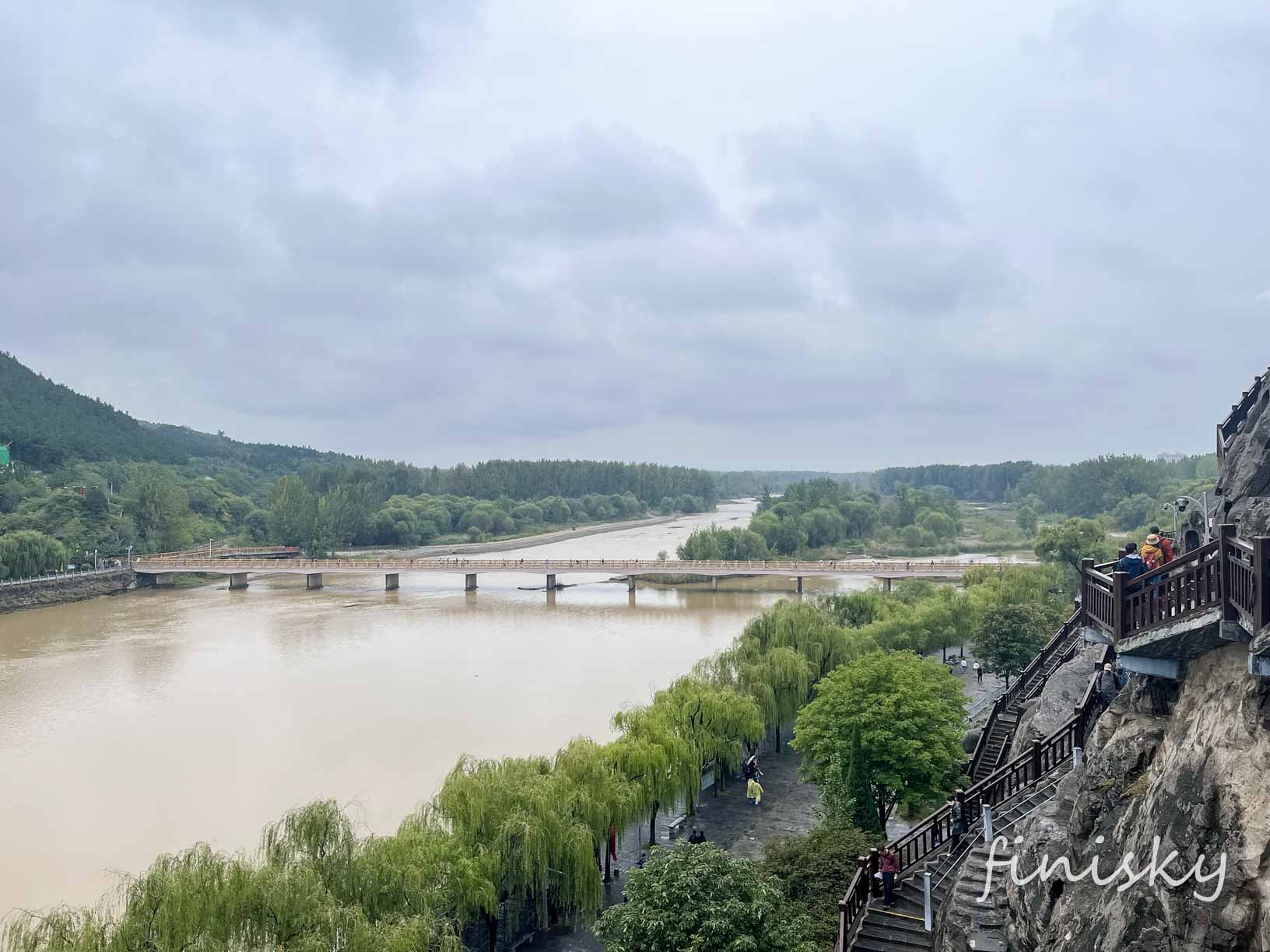 站在西山石窟上望南边的漫水桥,从此桥通往东岸各景点,伊河作为黄河的支流,真黄: