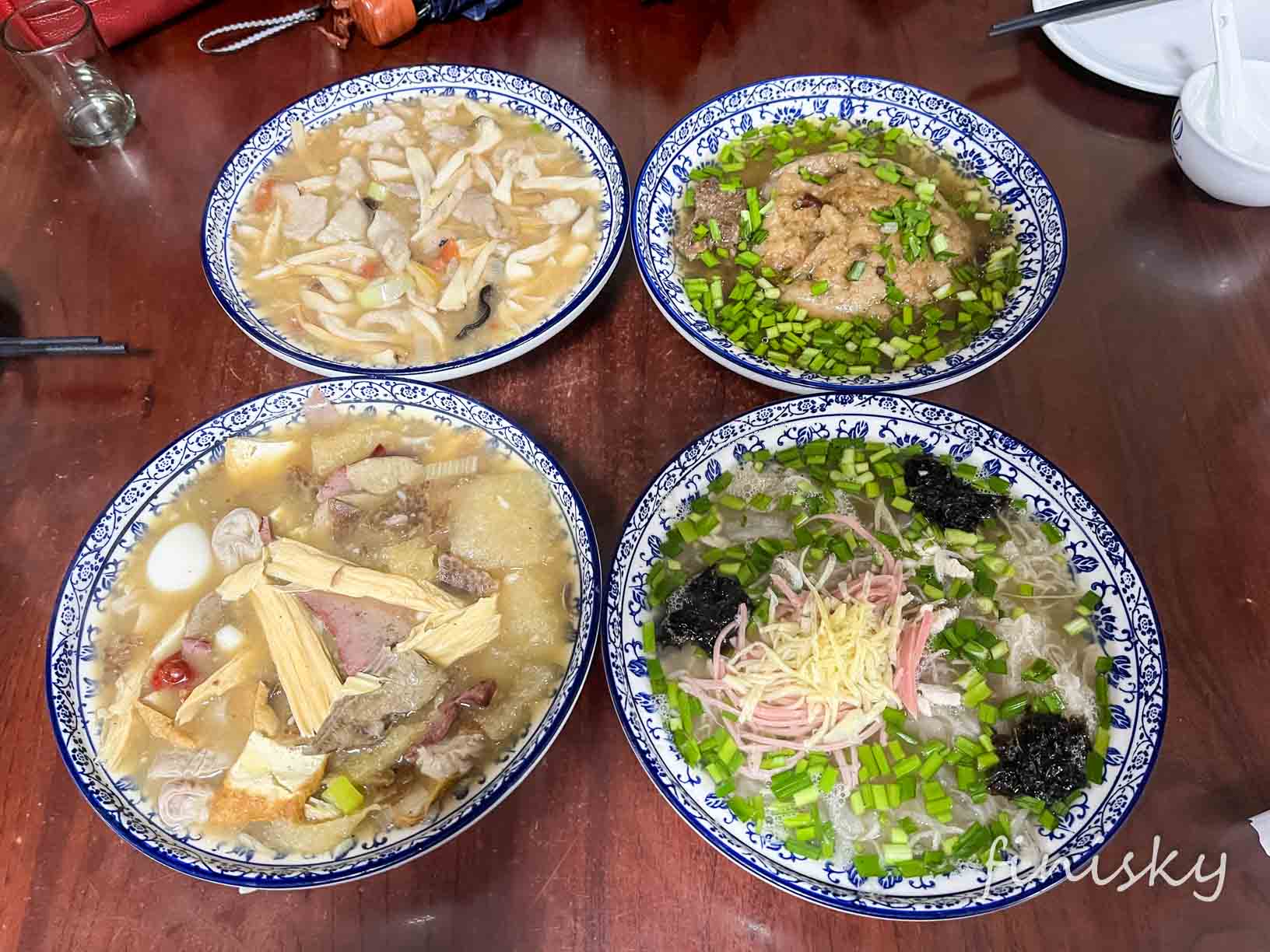坐下来之后,不知道怎么点,服务员推荐点了个三荤三素的套餐。(该说不说,这家店的服务确实极差,跟网上的评价一致。)这是四道主要的菜:连汤肉片,小酥肉,洛阳燕菜和洛阳熬货。