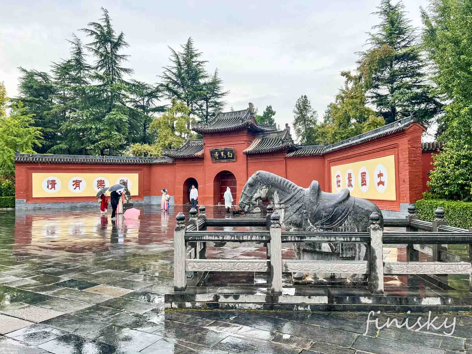 因为还在下大雨,白马寺门口的白马被雨水打湿后成了“黑马寺”。