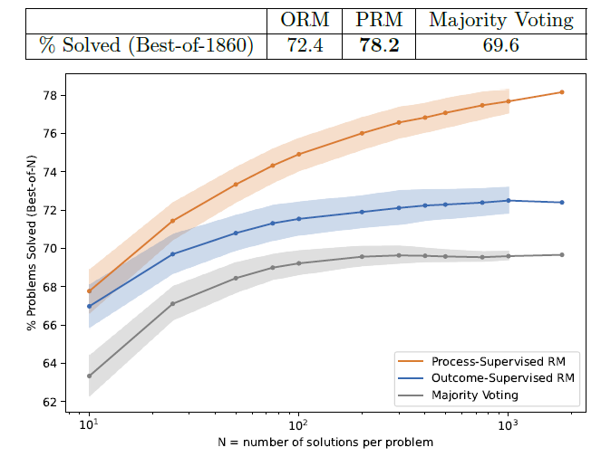 上图代表随着N的变化,模型在best-of-N设定下的性能。多数投票法作为基线也参与了对比,显然,PRM的效果远超ORM和多数投票法,且随着N的增大,差距越来越大。