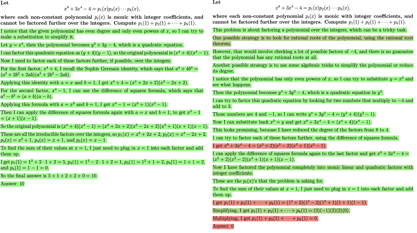 PRM 的训练有更多细节:训练PRM对每一步推理的最后一个token进行评判。让PRM对整个解答的每一步都进行预测,下图中是PRM对同一问题的两个不同解答的打分可视化,绿色代表PRM打出高分,红色代表低分(有错):
