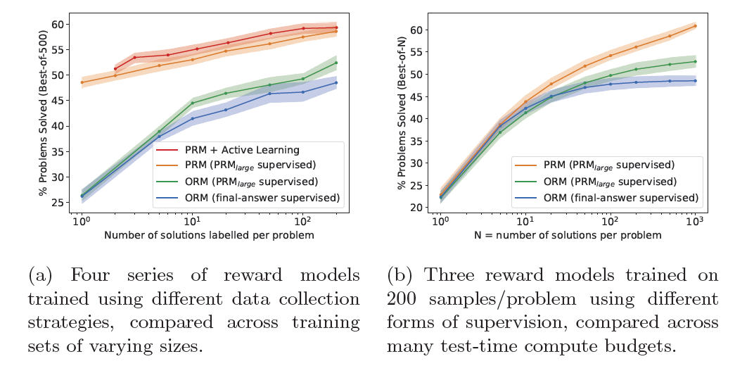 在此设定下,ORM的训练数据与PRM800K没有交集。期望用这样的数据集能训练出较强的 ORM 基线。但这么做带来的问题是训练集不同,两个模型不好直接比较。尽管如此,此处的PRM和ORM也代表了不同训练方法下的最优结果。