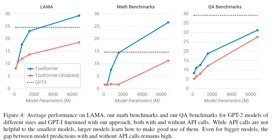 此外,作者验证了同样的方案在4个更小的GPT-2模型上的效果。发现使用工具的能力只有在模型规模在775M参数以上才涌现。