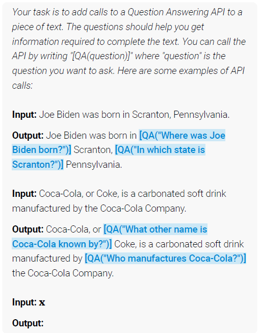 保留的采样位置集合,语言模型概率需要大于采样阈值$\tau_s$:$I={ i|p_i > \tau_s }$,仅保留概率最大的前$k$个。此采样方法的目的是筛选出最需要使用API调用的位置。使用的prompt样例:
