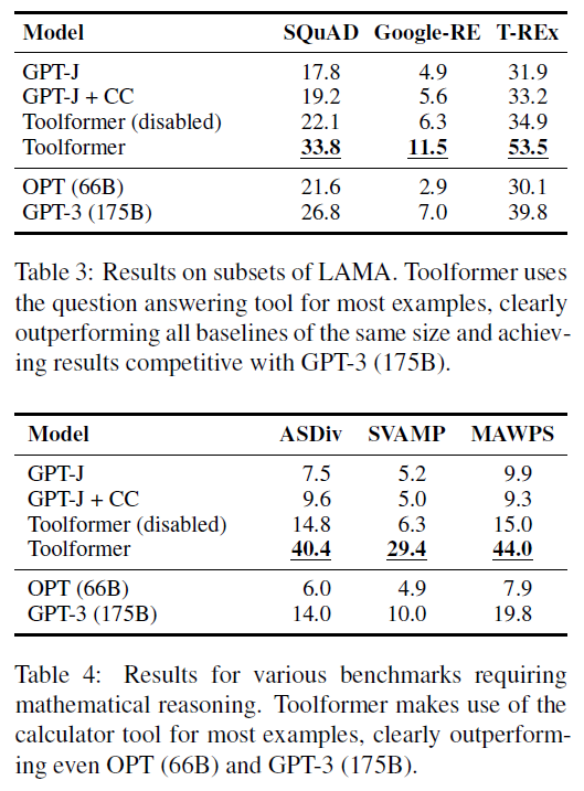 数学推理数据集上的结果在上图第二表格,GPT-J和GPT-J + CC的表现差不多,但即使禁用API调用,Toolformer的结果也明显更好。作者推测这是因为模型在许多API调用及其结果的示例上进行了微调,提高了其自身的数学能力。尽管如此,允许模型进行API调用可以使所有任务的性能提高一倍以上,并且明显优于更大的OPT和GPT-3模型。这是因为在所有基准测试中,对于97.9%的所有示例,模型都使用了计算器工具。